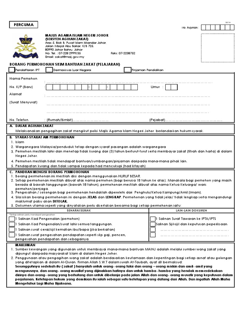 Permohonan hendaklah menggunakan BORANG PERMOHONAN BANTUAN ZAKAT ASAL MAJLIS AGAMA ISLAM NEGERI JOHOR yang boleh didapati di Ibu Pejabat Majlis Agama Islam. Jenis Bantuan Zakat UTM Johor. Borang Permohonan Bantuan Zakat 2022 Online.